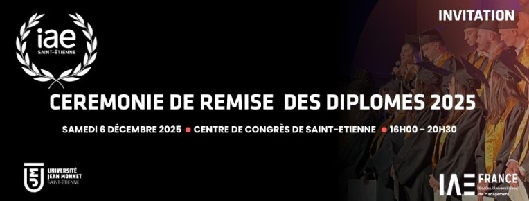 Toute l’équipe de l’IAE Saint-Étienne est heureuse de retrouver tous ses nouveaux diplômés lors d'une cérémonie de remise des diplômes qui aura lieu le samedi 06 décembre 2025, au Centre de Congrès de Saint-Etienne.